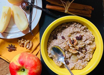 That is when I had such a surplus of apples lying at home, I thought of using them in our oatmeal. Apple pie flavors in breakfast oatmeal, its genius. Healthy yet feels indulgent! This is a great make ahead breakfast. It has become our favorite way of eating Oatmeal. The recipe below is made in an instant pot. I usually make this on a Sunday, and we eat it through the week. The Steel cut oats do tend to thicken up while sitting around and absorb all the water. Every time we want to eat this, I scoop it out in my cereal bowl, l and I add some liquid to make it to eating consistency and warm it up or eat it cold. Feel free to add any liquid of your choice, you can add almond milk or any other milk of your choice. I love to add some walnuts and raisins on top just before eating. You can also add any sweeter of your choice like brown sugar, honey or maple syrup.